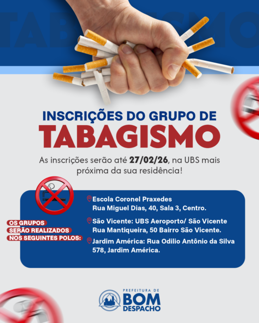 A Prefeitura de Bom Despacho informa que estão abertas, até o dia 27/02/2026, as inscrições para o Grupo de Combate ao Tabagismo.